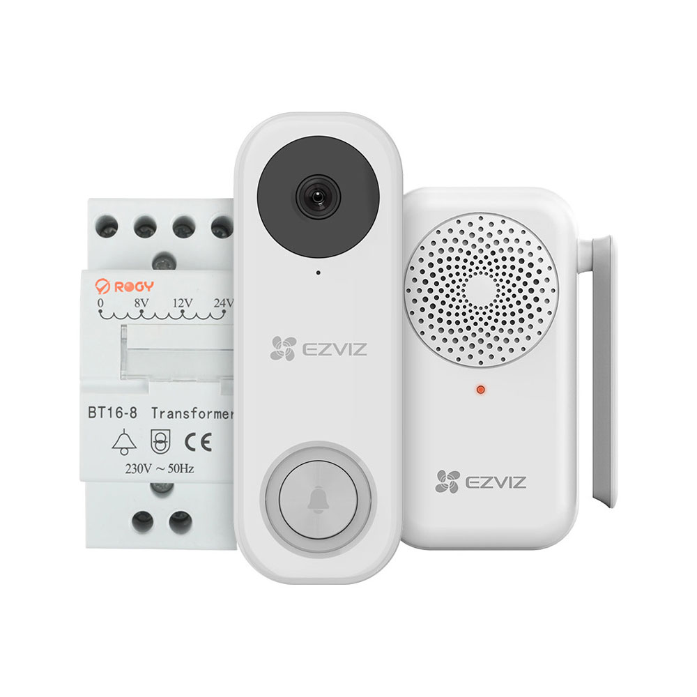 Ezviz smart video door entry kit + doorbell + transformer. PIR motion detection. 2MP video resolution (1535×1536). Night vision up to 5 meters. Watch from anywhere. Two-way conversation. 170 ? horizontal field of view. Protection against water and dust with degree of protection IP65. 2.4 / 5 GHz Wi-Fi