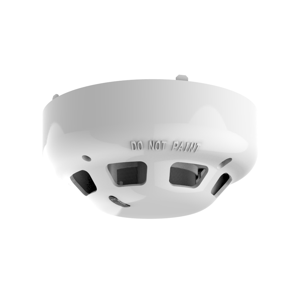 Conventionele foto-elektrische rookmelder. Verwijderbare, hoogwaardige kamer. Enkele vuur-LED – 360° bekijken. Remote Indicator-uitgang. IP42 ABS-kunststof. Witte kleur. EN554 deel 7.